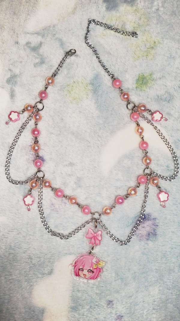 Collar tipo choker de aproximadamente 44 cm de largo. Fornituras de hierro niquelado y cadenas de aluminio. Con cuentas y carita de acrílico de aprox 3 cm.