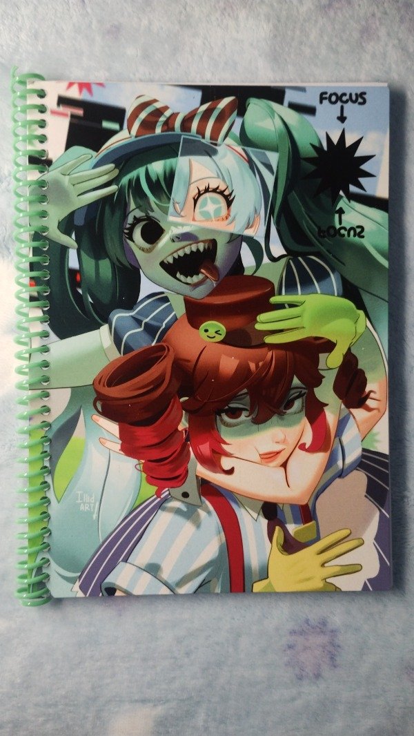 Cuaderno anillado de 15 x 21 cm. Ambas tapas impresas (con el mismo dibujo). Aproximadamente 50 hojas lisas.